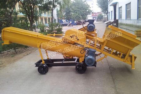 本攪拌機(jī)為便于運(yùn)輸及存放,采用分體式結(jié)構(gòu)。水泥輸送帶、沙子輸送帶、細(xì)石輸送帶為一部件,螺旋攪拌為一部件。為便于活動(dòng)以上各部件都裝有拖輪或滾輪。運(yùn)輸時(shí)攪拌機(jī)構(gòu)放下支腿使導(dǎo)軌輪離地即可裝車運(yùn)輸。